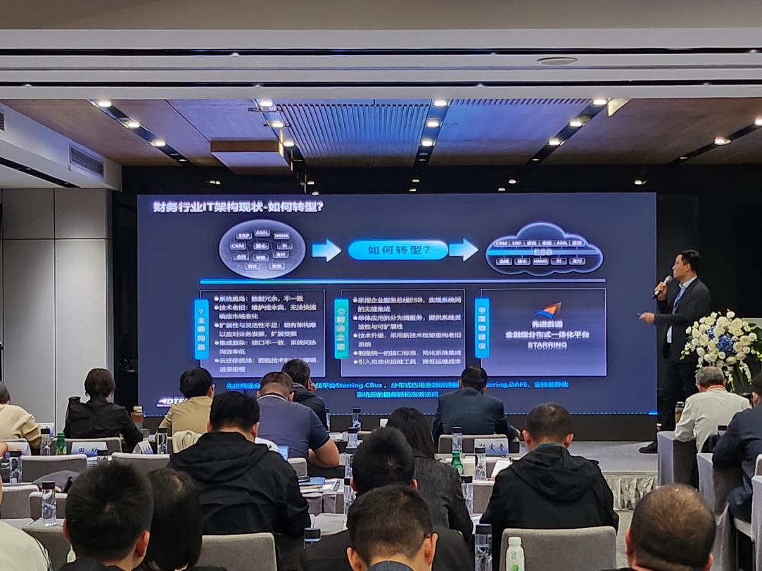森林舞会代表讲师郭钰以《昆仑与森林舞会ESB解决方案助力财务行业创新与架构转型》为主题作发言分享。他深入剖析了当前财务行业IT架构面临的挑战,包括系统孤岛、技术老旧、扩展性不足等问题,并提出了基于企业服务总线(ESB)和微服务架构的转型方案。